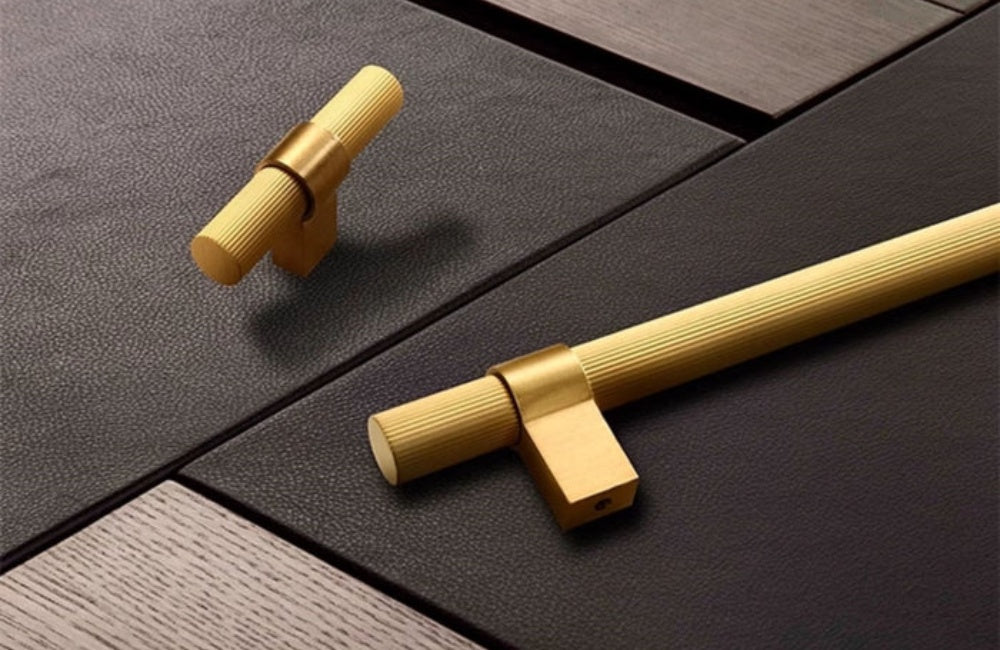 Crafted from solid brass, these handles feature a textured knurled pattern, giving them a unique, industrial look while enhancing grip. The T-bar shape provides a sleek, minimalist silhouette, making them a perfect fit for contemporary and transitional spaces. With their luxurious brass finish, these handles not only add durability but also a refined, sophisticated touch to any cabinet or drawer.
