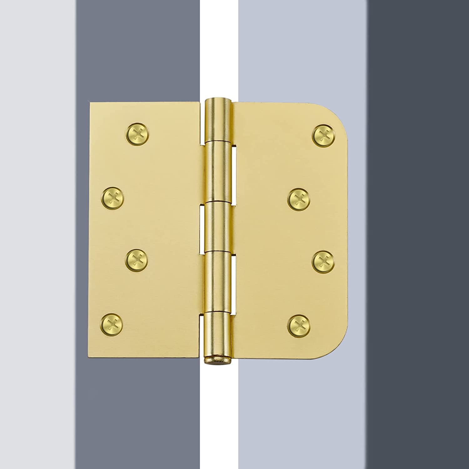 - Satin Gold Finish - 4 inch x 4 inch, the round side is 5/8'' Radius Corners another side is square - We recommend you to apply 3 hinges for each exterior and interior door.